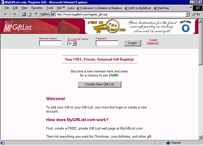 window is opened up which asks the user to login to MyGiftList.com or